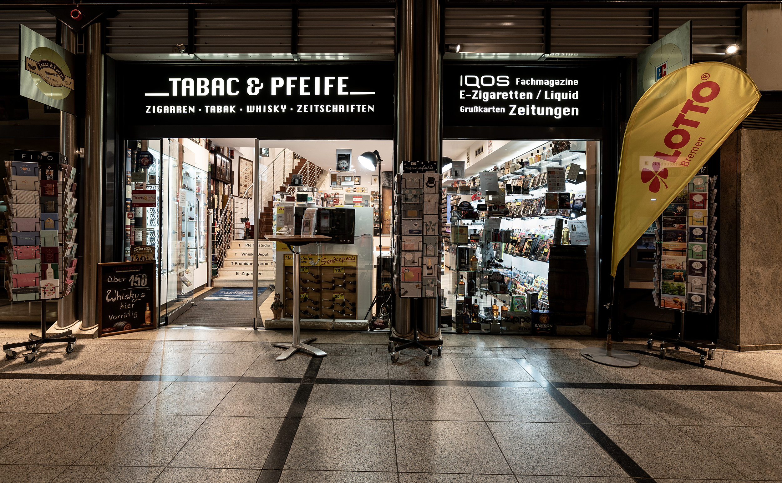 In unserem Geschäft präsentieren wir Ihnen auf einer größeren Fläche unser Sortiment. Im Erdgeschoss finden Sie Zeitschriften, Tabakwaren, Lotto und im ersten Obergeschoss unsere große Auswahl an Zigarren, Whisky, Rum, Pfeifen, RBA und E- Zigaretten. Nach dem Motto "Kiek mol wedder rin!" freuen wir uns auf Ihren Besuch.